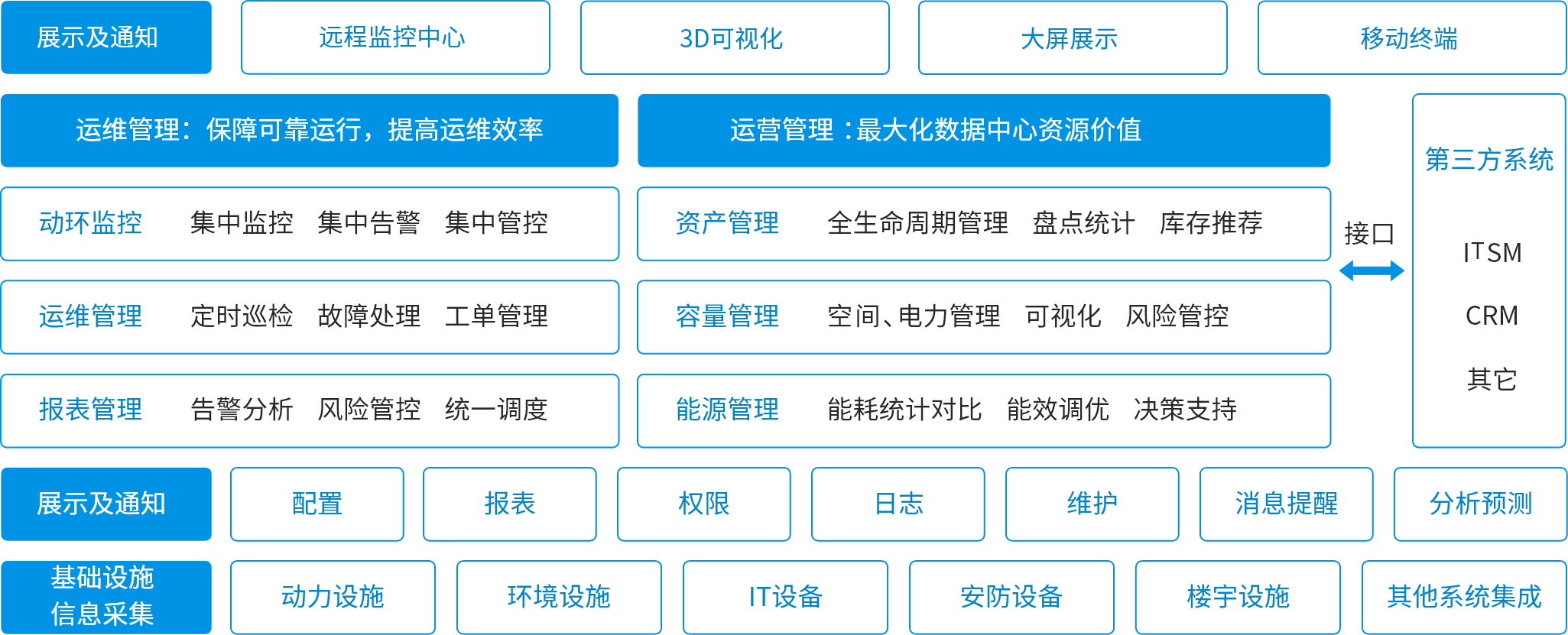 DCIM基礎(chǔ)設(shè)施管理系統(tǒng)通過統(tǒng)一的操作平臺(tái)和統(tǒng)一的通信平臺(tái),構(gòu)建“信息、資源"綜合監(jiān)控管理體系。系統(tǒng)融合基礎(chǔ)設(shè)施監(jiān)控、資產(chǎn)管理、容量管理、能效管理、運(yùn)維管理、三維可視化等豐富的管理功能,幫助數(shù)據(jù)中心管理者全面掌握基礎(chǔ)設(shè)施整體運(yùn)行情況,提高數(shù)據(jù)中心資源利用率和管理效率。
